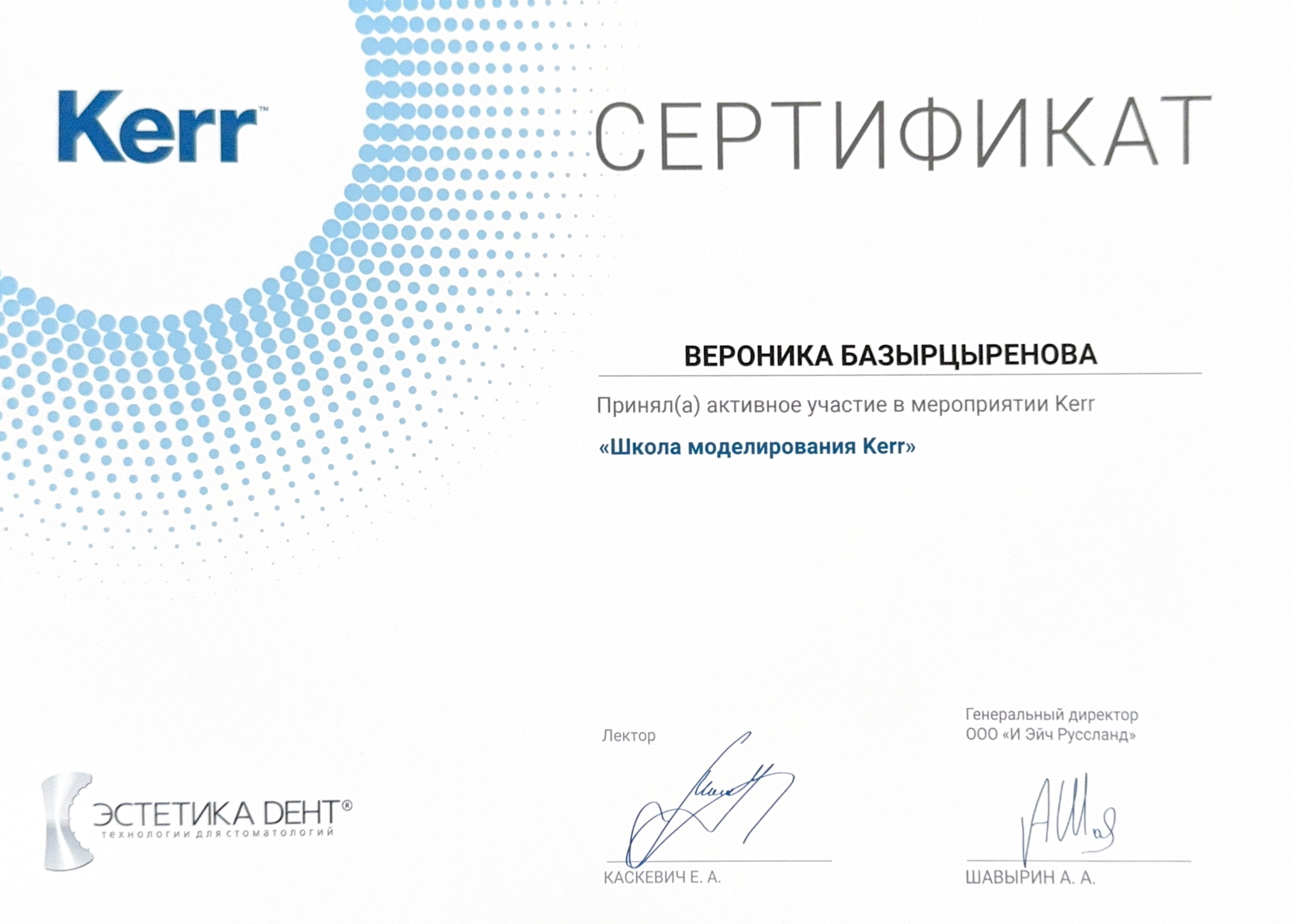 — Курс «Эффективный тайм-менеджмент при лечении детей в условиях общего обезболивания с применением коронок из диоксида циркония», Сертификат, сентябрь 2025