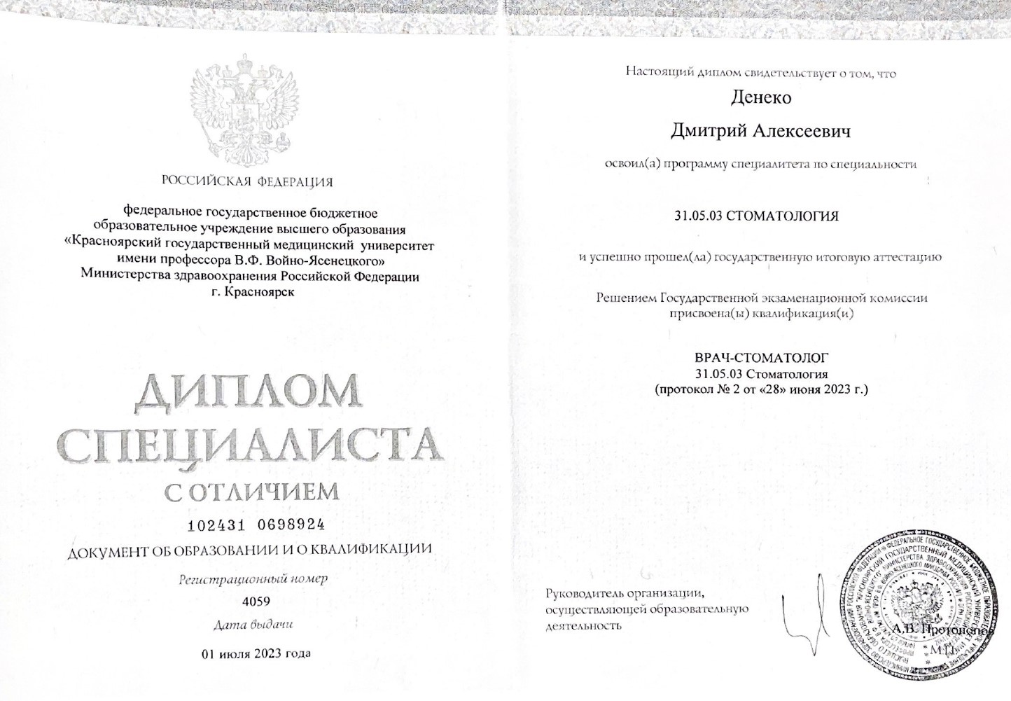 Окончил «Красноярский государственный медицинский университет имени профессора В.Ф. Войно-Ясенецкого» по специальности «Стоматология», 01.07.2023