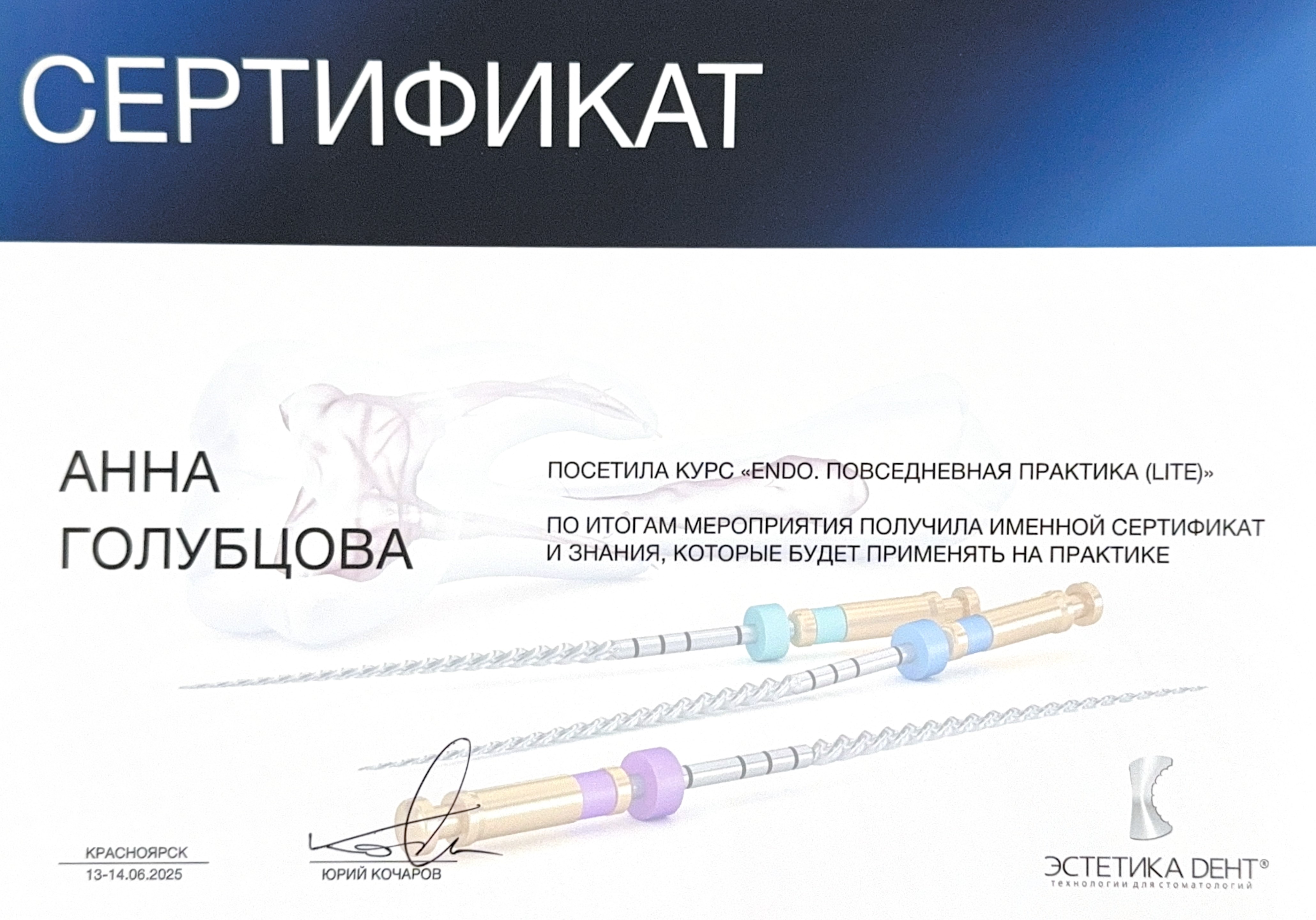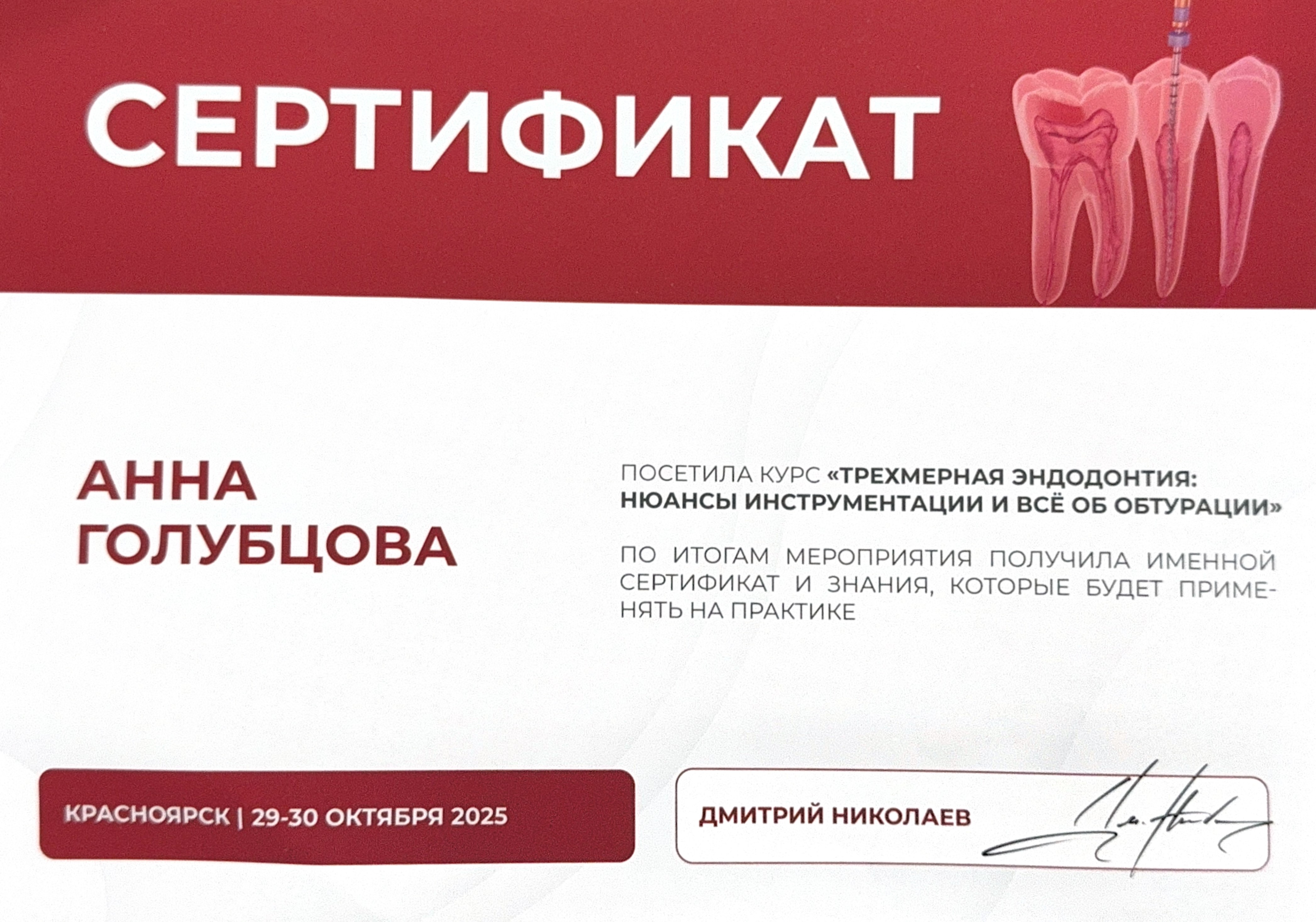 — Курс «Трехмерная эндодонтия: нюансы инструментации и всё об обтурации», Сертификат, 29.10-30.10.2025