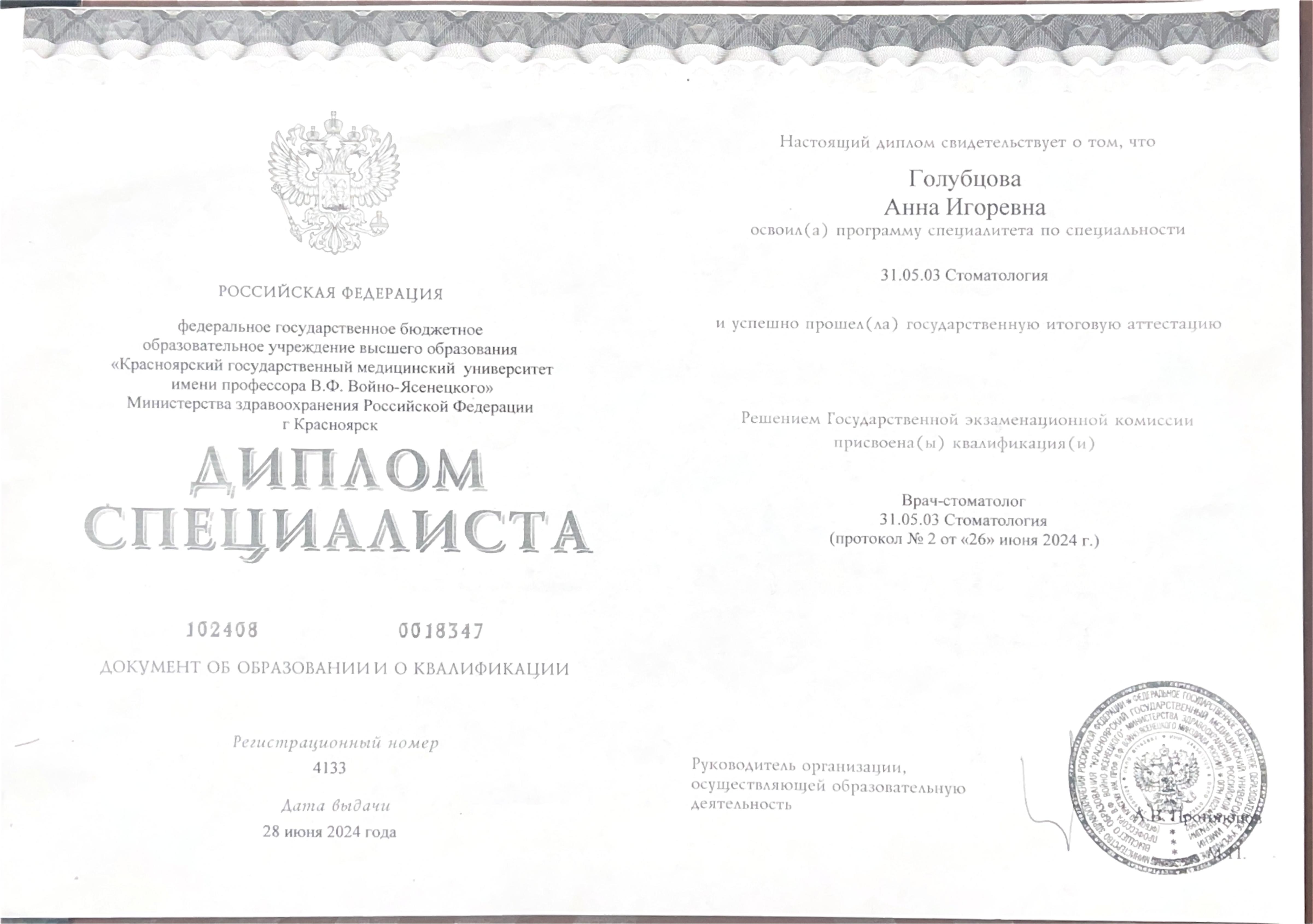 имени профессора В.Ф. Войно-Ясенецкого» по специальности