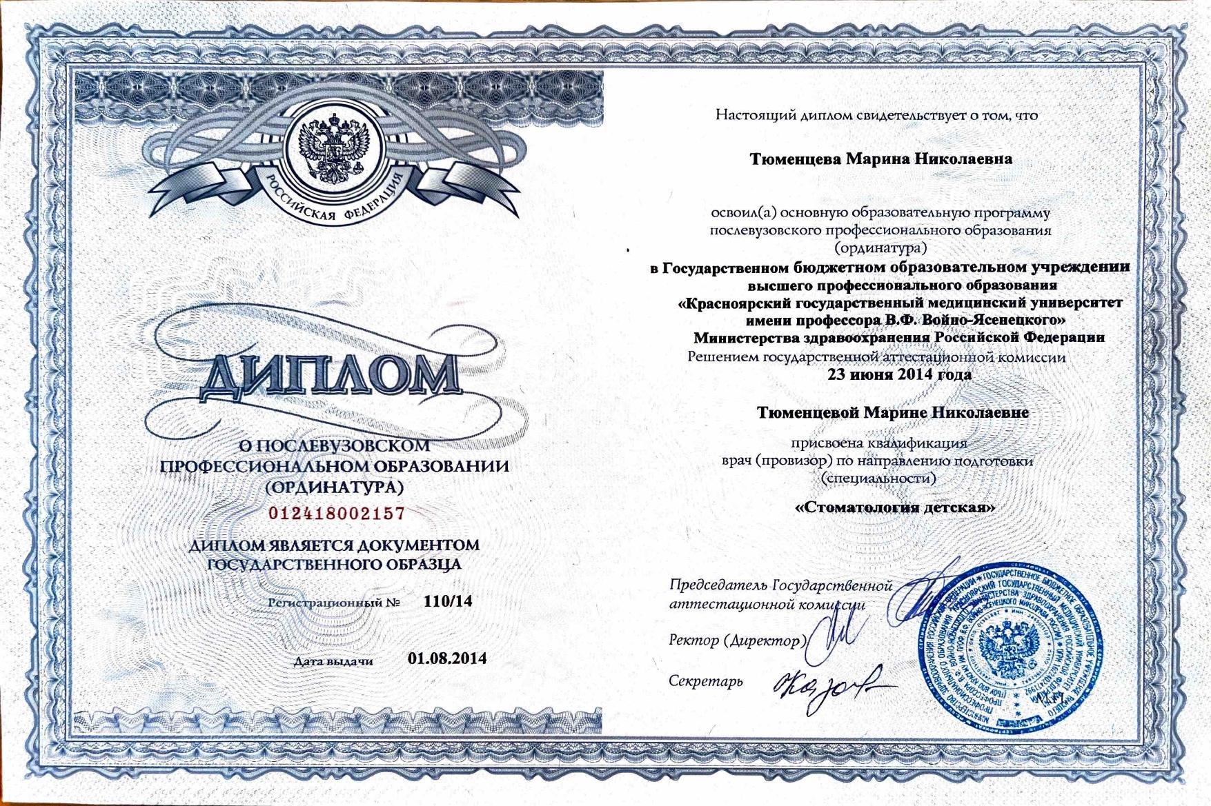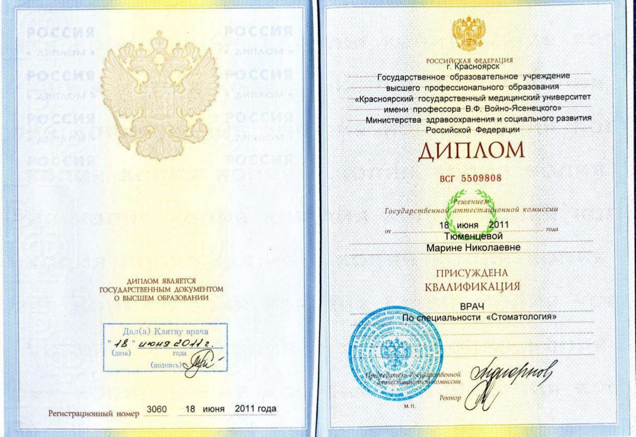 Образование: Окончила «Красноярский государственный медицинский университет имени профессора В.Ф. Войно-Ясенецкого» по специальности «Стоматология», 18.06.2011 Ординатура: «Красноярский государственный медицинский университет имени профессора В.Ф. Войно-Ясенецкого» по специальности «Стоматология детская», 01.08.2014 Специализация: Эндодонтическое лечение, лечение под микроскопом, реставрация зубов Профессиональная переподготовка: Квалификация «Врач-стоматолог детский» Дополнительное образование и повышение квалификации: — Курс «Повторное эндодонтическое лечение», Сертификат, 10.04-11.04.2025 — Курс «Базовая хирургическая стоматология», Сертификат, июль 2024 — Курс «Недетские реставрации version 2.0. 1 класс», Сертификат, март 2024 — Курс «Детская стоматология», Сертификат, январь 2024 — Практический семинар «Планирование ортопедического лечения», сертификат, 30.03-31.03.2019 — Семинар «Подробный ортопедический протокол. ПЛанирование, препарирование, провизорные рестави, ретракция, оттиски, адгезивная фиксация», Сертификат, 14.10.2018