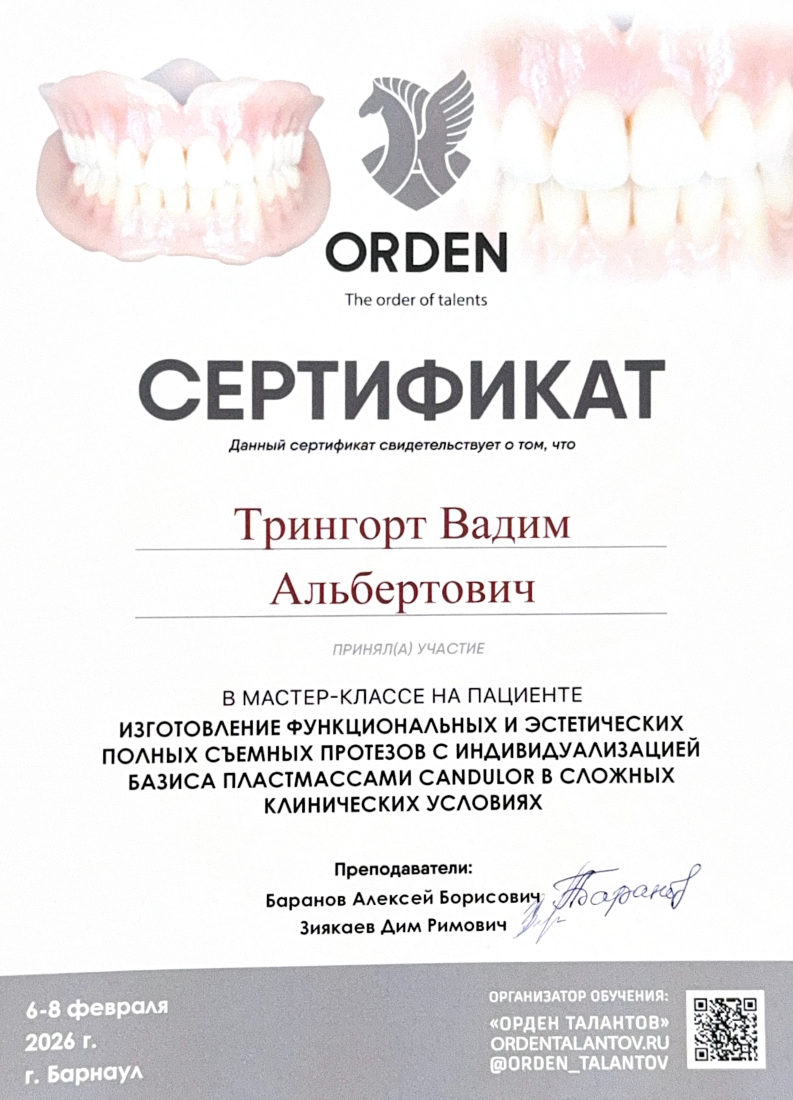 — Мастер-класс «Изготовление функциональных и эстетических полных съемных протезов с индивидуализацией базиса с пластмассами Candulor а сложных клинических условиях», Барнаул, 6-8 февраля 2026
